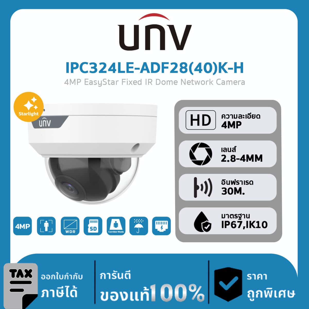 กล้องวงจรปิด UNV รุ่น IPC324LE-ADF28(40)K-H 4MP EasyStar Fixed IR Dome Network Camera