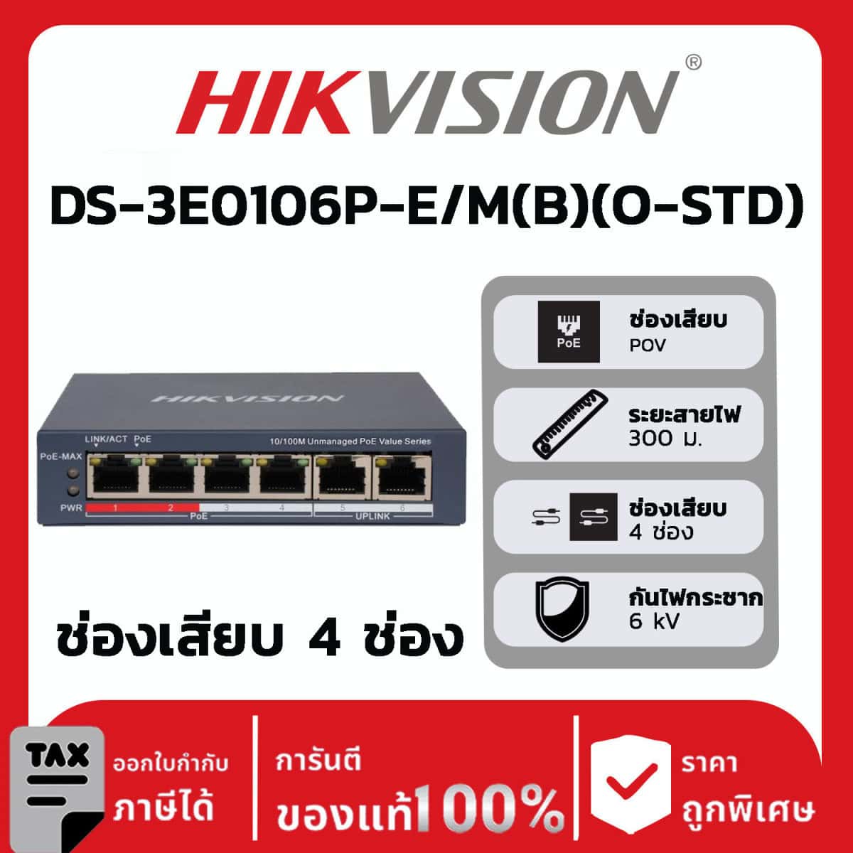 - พอร์ต PoE 10/100Mbps จำนวน 4 พอร์ต และพอร์ต RJ45 10/100Mbps จำนวน 2 พอร์ต