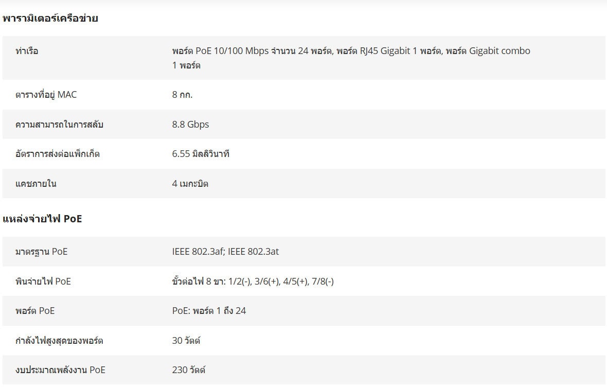 • ระบบจัดการพลังงาน PoE อัจฉริยะ เมื่อกำลังไฟที่จ่ายเกินขีดจำกัด พอร์ต PoE จะจัดการกำลังไฟอย่างชาญฉลาด ซึ่งจะช่วยยืดอายุการใช้งานของสวิตช์