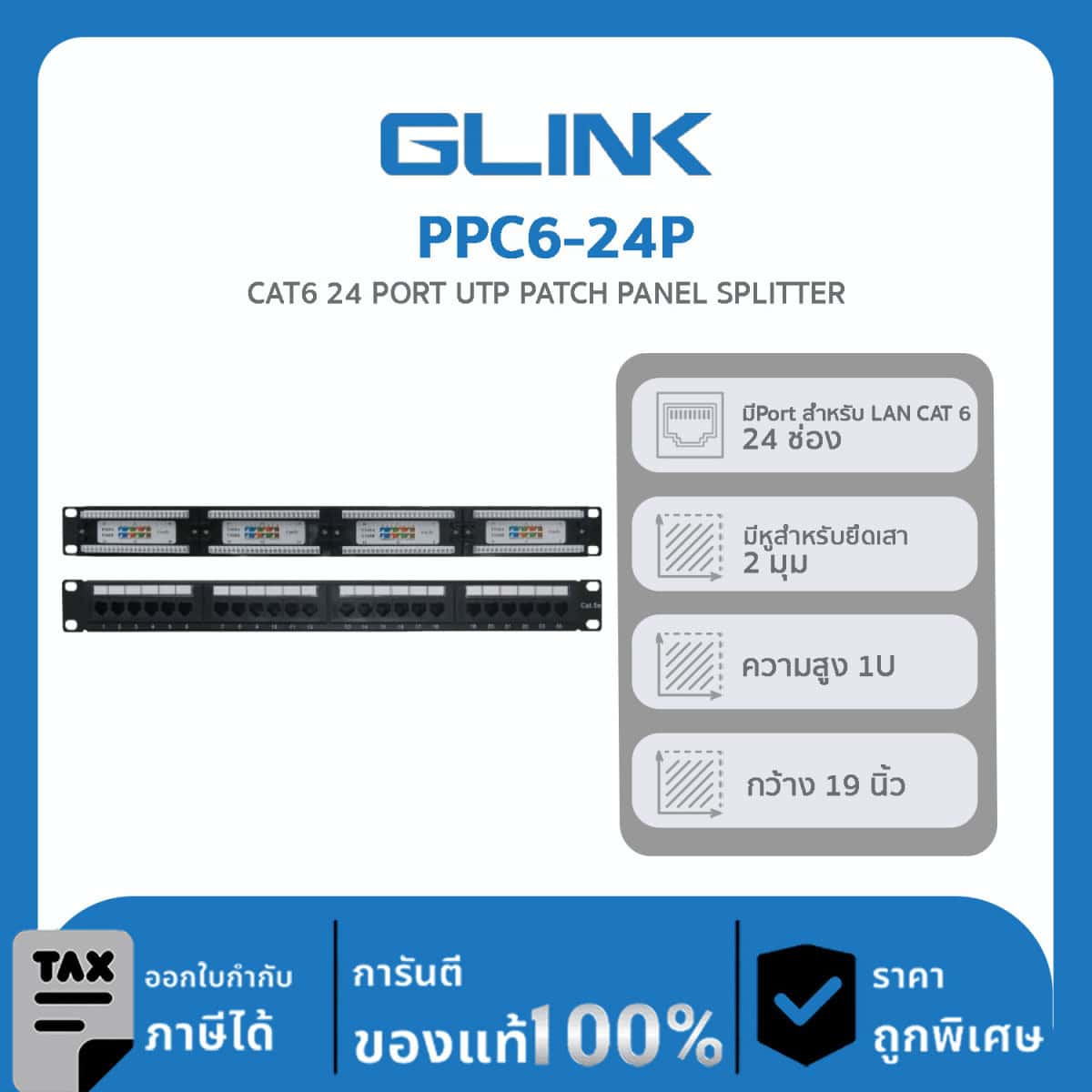 แผงกระจาย สาย LAN 1U สำหรับตู้แร็ค 19“ GLINK รุ่น PPC6-24P