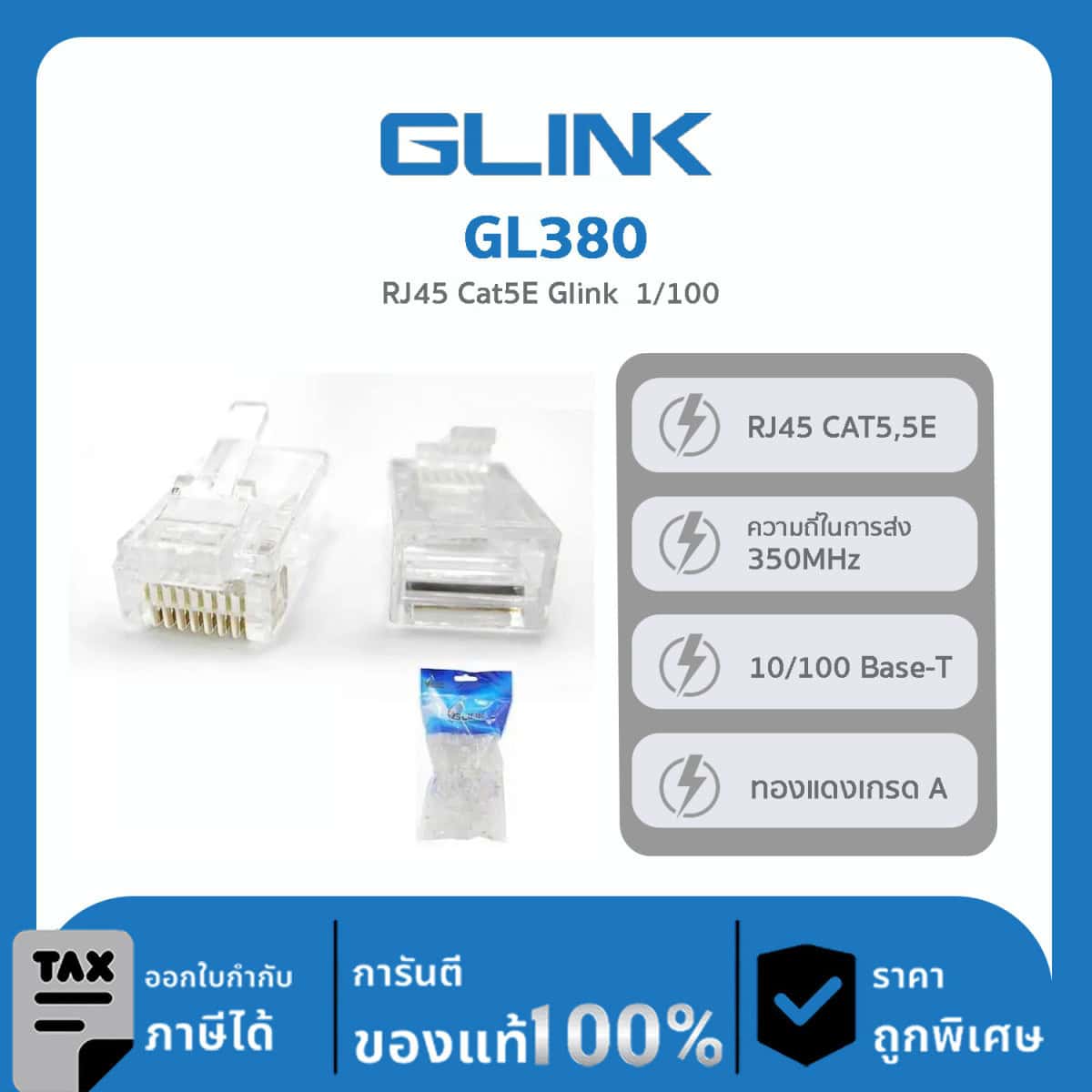 Glink GL380 หัวแลนคุณภาพสูง ทองแดงเกรด A ไม่กรอบแตกหักง่าย ใช้กับสายแลน CAT5, 5E