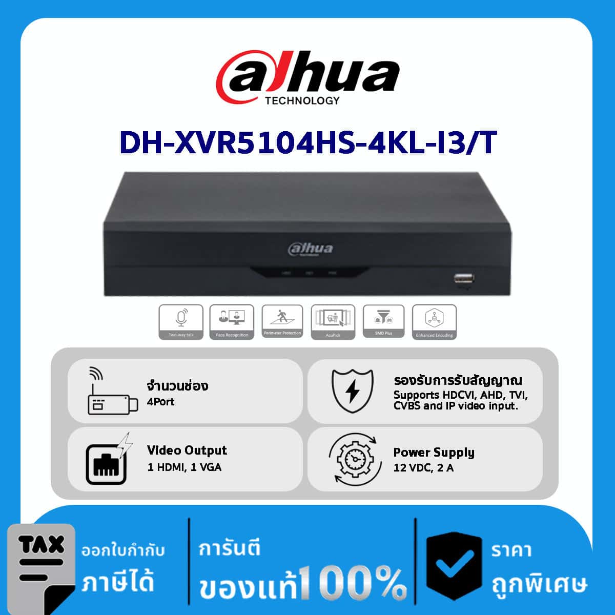 HDCVI Recorders รุ่น DH-XVR5104HS-4KL-I3/T 4CH Penta-brid 4K Value/5MP Compact 1U 1HDD WizSense Digital Video Recorder