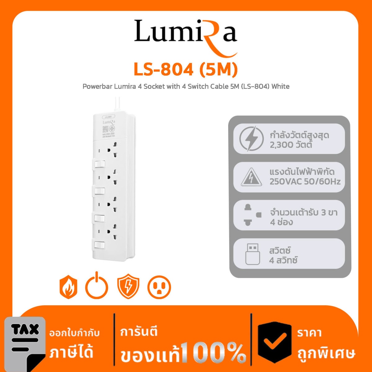 Lumira Power Strip รุ่น LS-804 (5M) Powerbar Lumira 4 Socket with 4 Switch Cable 5M (LS-804) White