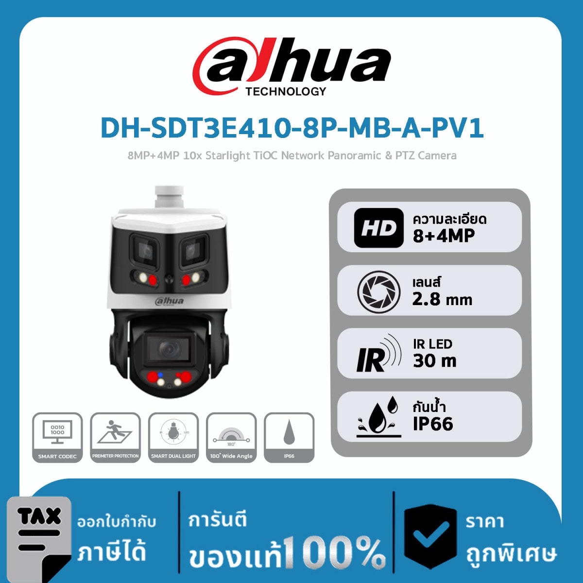 PTZ Cameras Dahua รุ่น DH-SDT3E410-8P-MB-A-PV1 8MP+4MP 10x Starlight TiOC Network Panoramic & PTZ Camera