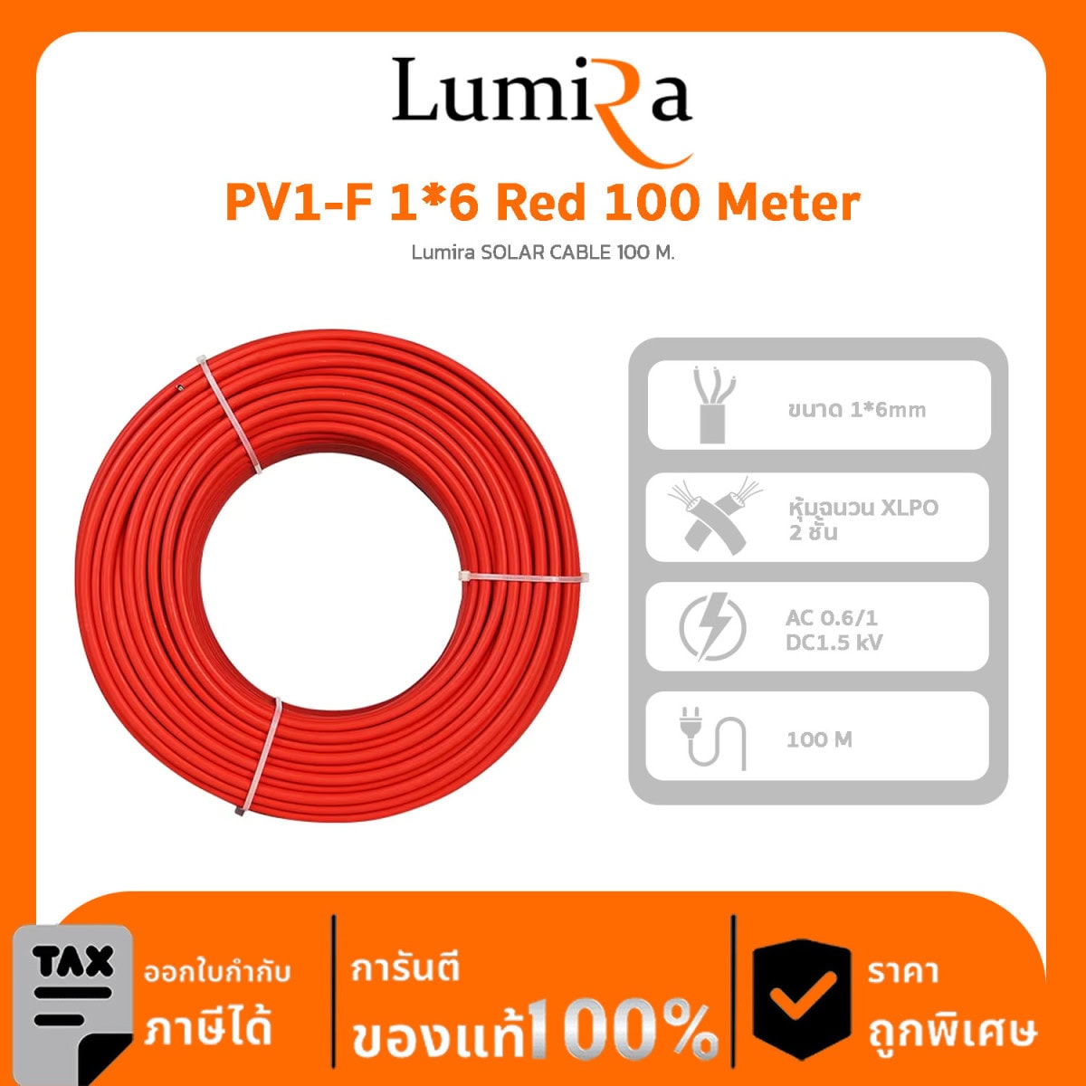 Solar Cable Lumira รุ่น PV1-F 1*6 Red 100 Meter 100 Meter สายไฟ PV ขนาด 6 sq.mm.