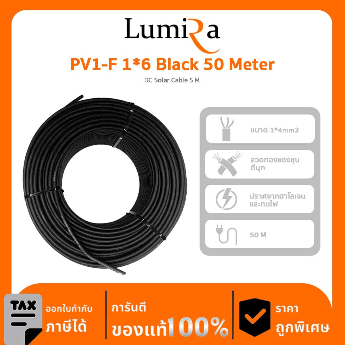 Solar Cable Lumira รุ่น PV1-F 1*6 Black 50 Meter สายไฟ Solar DC สำหรับ โซล่าเซลล์