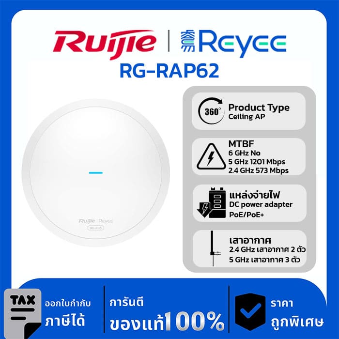 Wireless AP รุ่น RG-RAP62 อุปกรณ์กระจายสัญญาณติดเพดานมาตรฐาน AX1800 ที่รองรับ Wi-Fi 6